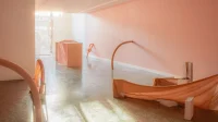 Gesture is an exploration of movement and shape in reference to the human body. New viewpoints are revealed when navigating through the space, giving rise to a shifting tension and beauty. The space is created to allow for an intimate experience between the viewer and the objects. Purpose-built for Lamington Drive and Looking Glass, Nat has transformed the space using colour, form, light and shadow, to offer the perfect launchpad for observational drawing and documentation.