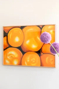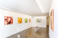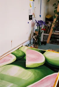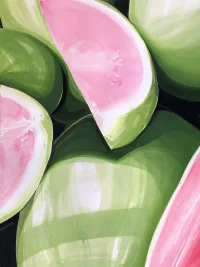 Market Fan Club is a suite of radiant and joyful large-scale paintings by emerging Melbourne artist Evie Cahir. Inspired by daily trips to the Queen Victoria Market, these crops of fruit and vegetables capture the shifting intensities of the sun and seasons. The largest works created by Cahir to date successfully balance a bold and meticulous application, seen in the delicate fruit stems and textural detail alongside gutsy gestural sweeps of paint. Market Fan Club champions the shapes, colours, sounds and smells of the marketplace.