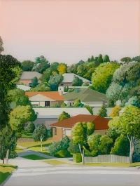 According to Bowers the work ‘evokes a sanguine sensation: you are both immediately on a foreign holiday yet catapulted back to the street you grew up on.’ [...]This narrative between familiar suburban inclines and adventitious verandah views allows us to temporarily exist in a state of balmy flow. ‘Pan Flute to a Dog’s Ear’ is a deep wellspring of powder-coated, sun faded nostalgia. Viewed as a whole, the works are a warm morning trickled into a mild evening, with precious details of luminous watering cans, creamy concrete porches and delicately limned leaves.