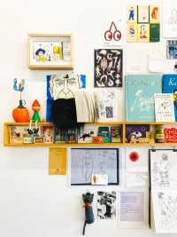 Alongside her illustration practice, Kat is a dedicated observational drawer. A fan of life-drawing classes and ‘Daily Doodles’, she finds getting lost in the ‘act’ of drawing an equally enjoyable experience to the hyper-conscious nature of drawing for a client. For this exhibition Kat observes details of her studio workspace, paying homage to the treasured, ever-evolving family of ephemera she has chosen to surround herself with. Sitting amongst this are things by, or referencing, artists and illustrators that interest her. All this ‘stuff’ inspires, amuses, and keeps watch, as she works.